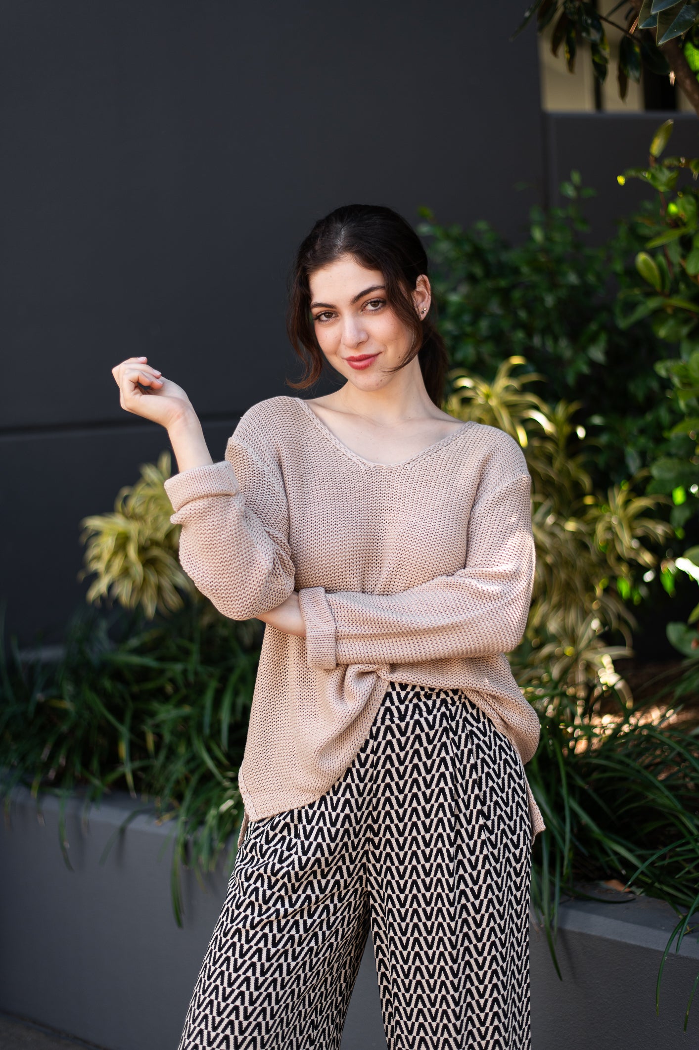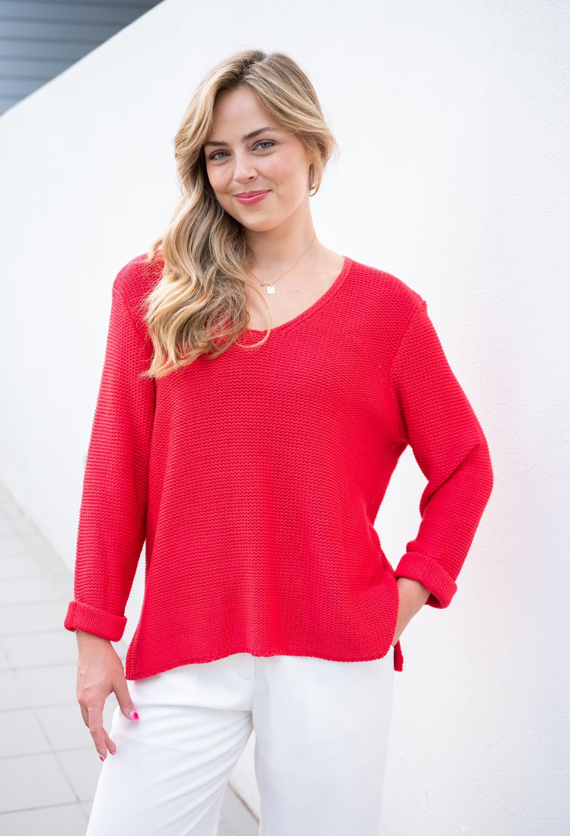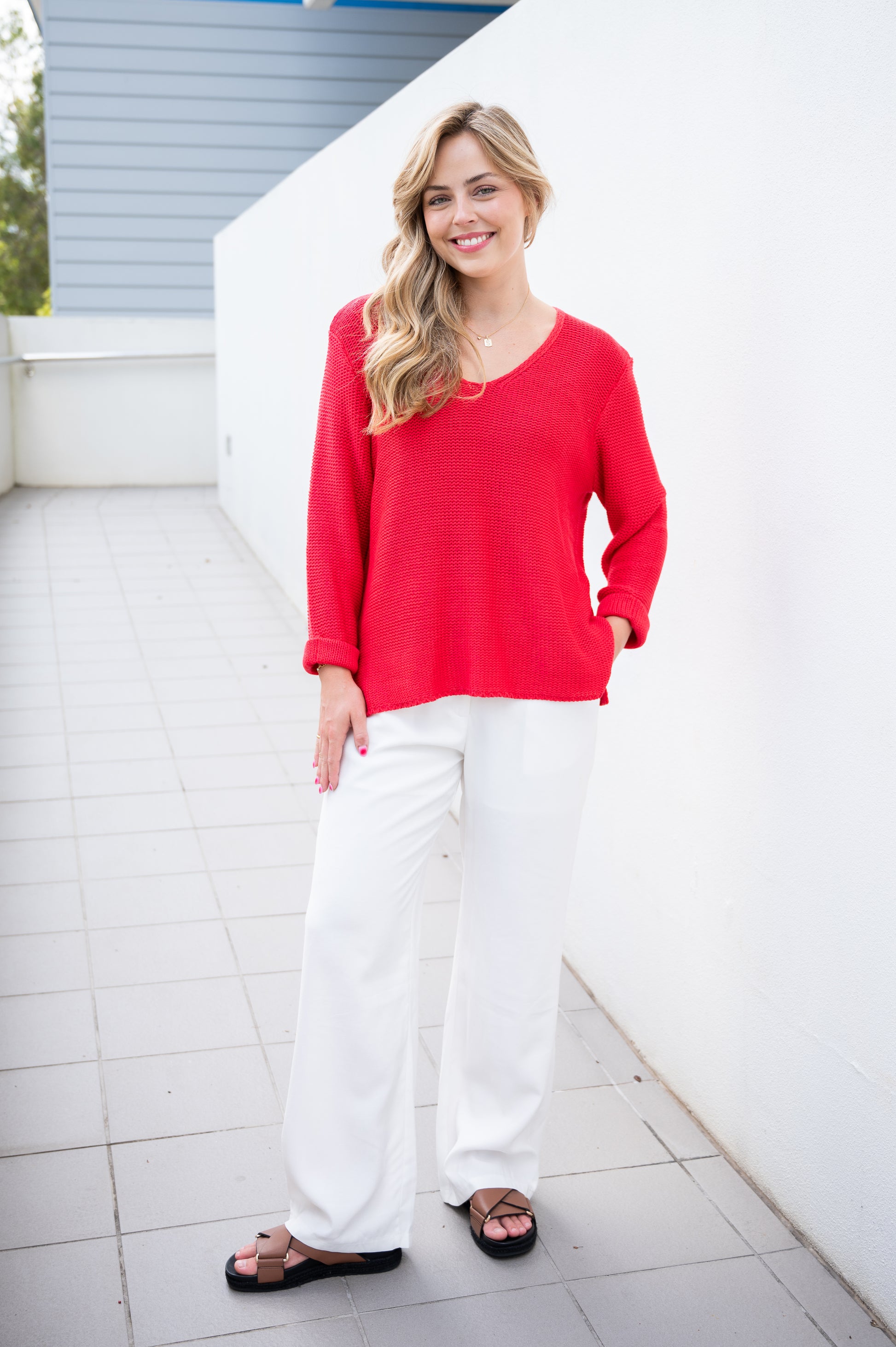 Available in a gorgeous bright red or a mocha colour. Pair her with a blazer and skirt for the office or some wide leg pants and sneakers for a day with the kids.