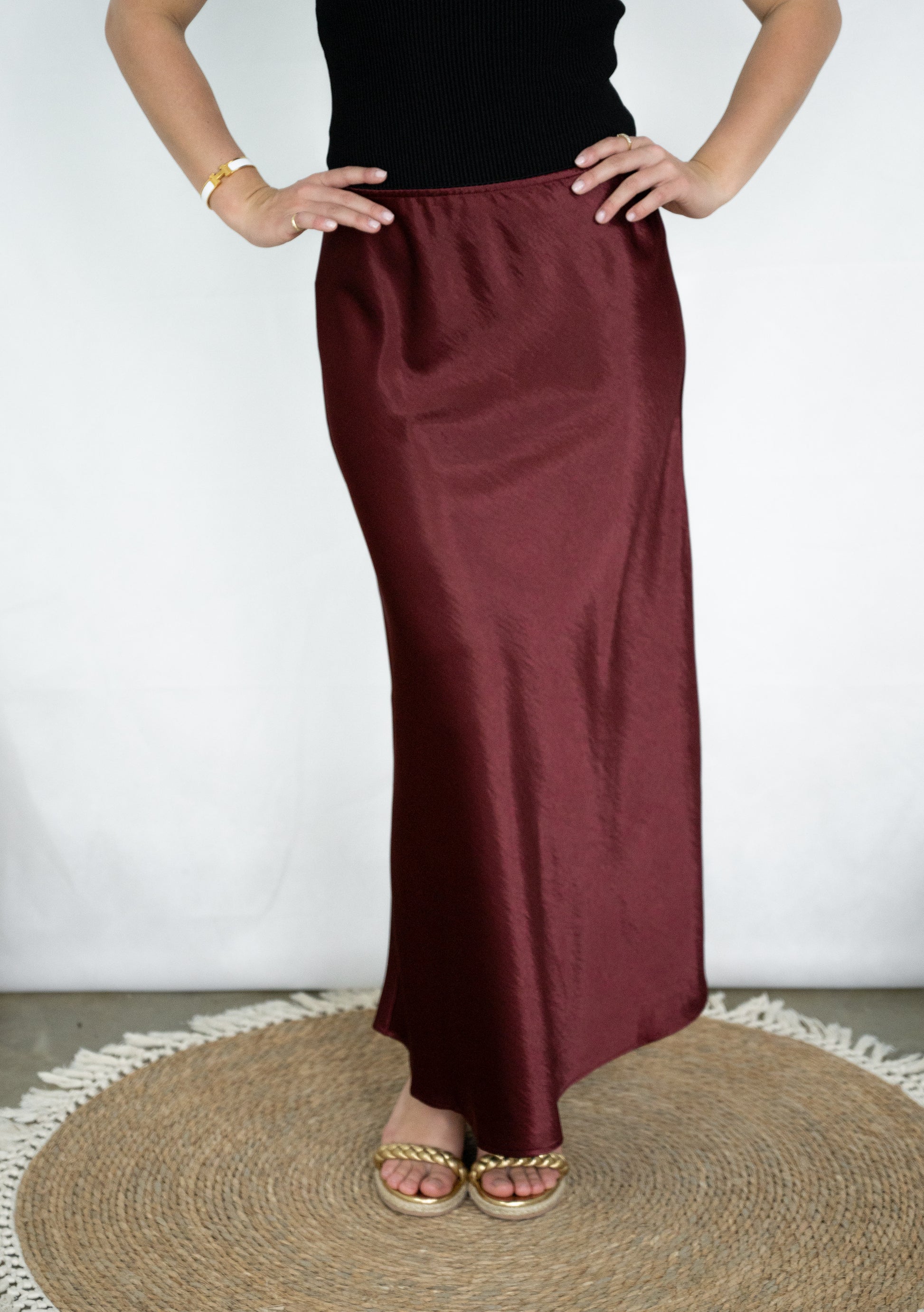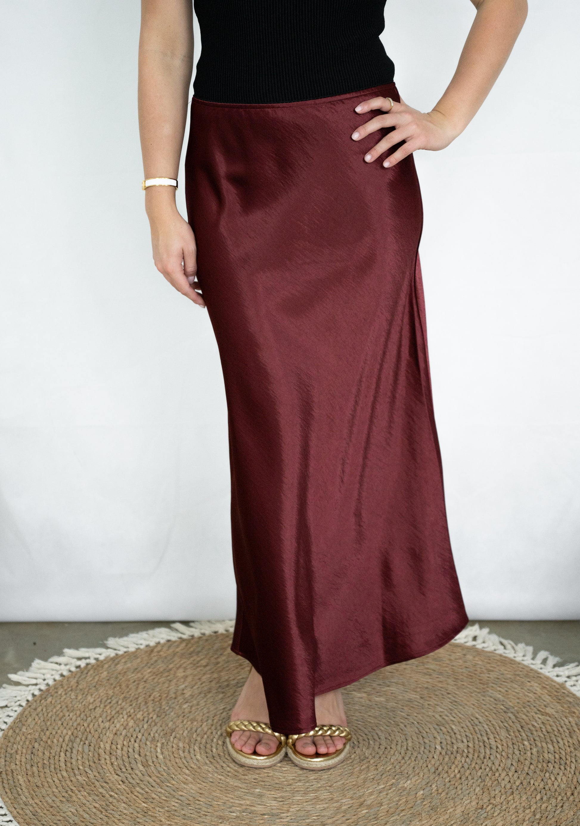 Our Sasha Skirt in burgundy (the colour of the season) has a beautiful luxurious feel to it and you will feel ultra luxe wearing it.